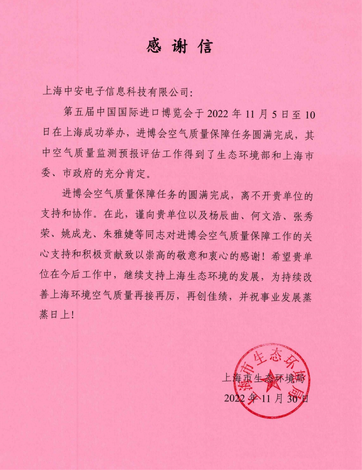 上海環(huán)監(jiān)中心就中安科技在21年國際進博會空氣質量監(jiān)測預報工作中杰出貢獻送來感謝信!(2021/12/31)